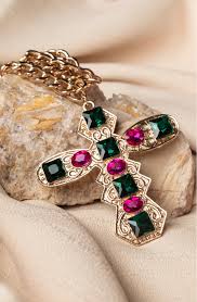 Collar verde y rosa de diamante en forma de cruz